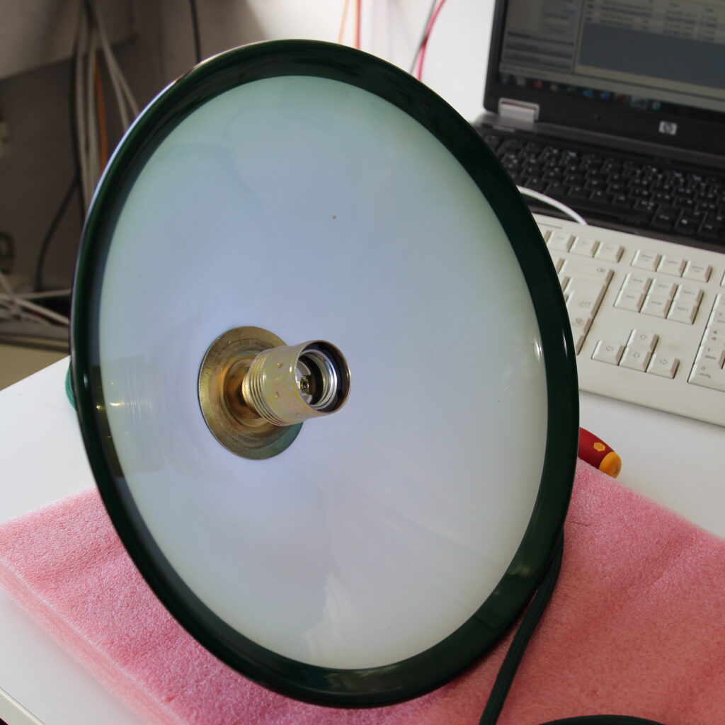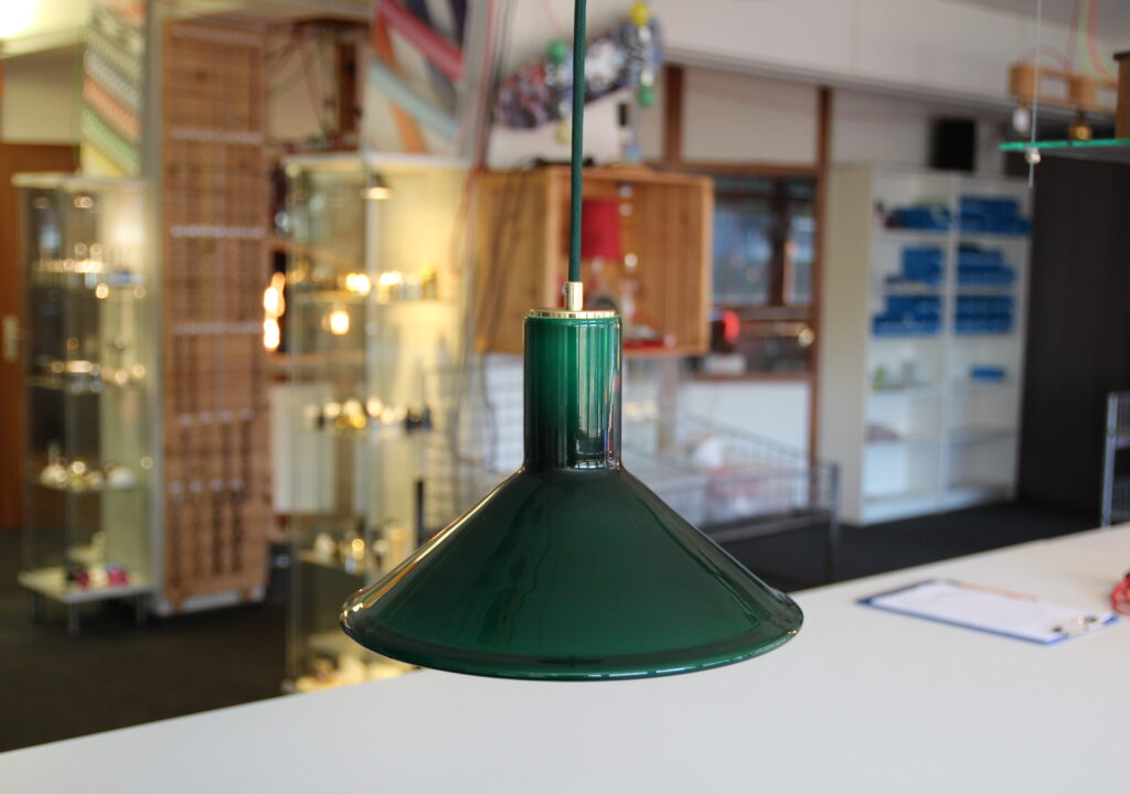 Unsere Kundin übergab uns einen grünen Glasschirm mit der Bitte, eine passende und sichere Aufhängung zu konstruieren, da die ursprüngliche Befestigung nicht mehr vorhanden war.