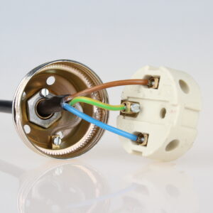E27 Fassung Zugentlaster Metall vermessingt mit Stahlseil Befestigung_5 Textilkabel Fachhandel