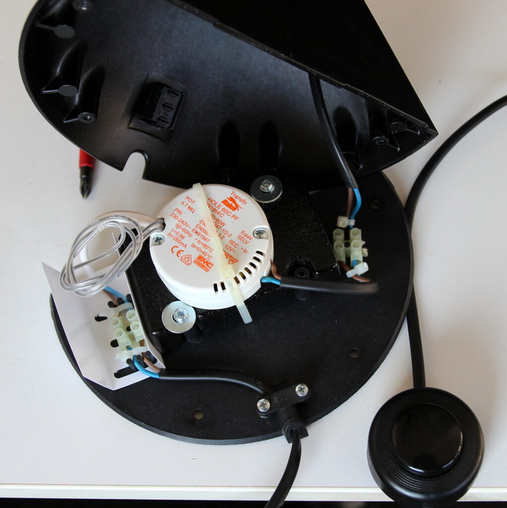 Im Lampenfuß befindet sich ein elektronischer Trafo, der die Netzspannung von 230 Volt auf 12 Volt reduziert, damit das Halogen-Leuchtmittel betrieben werden kann.