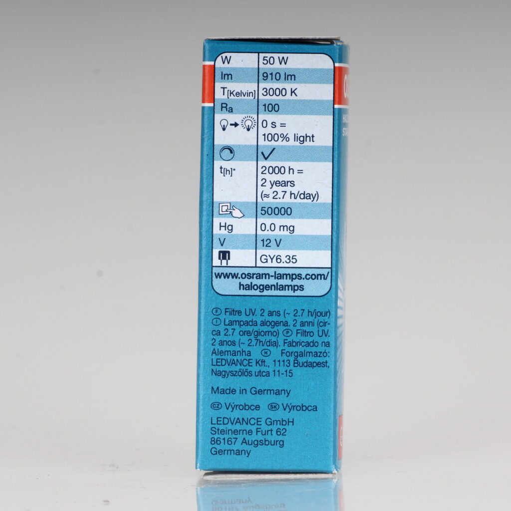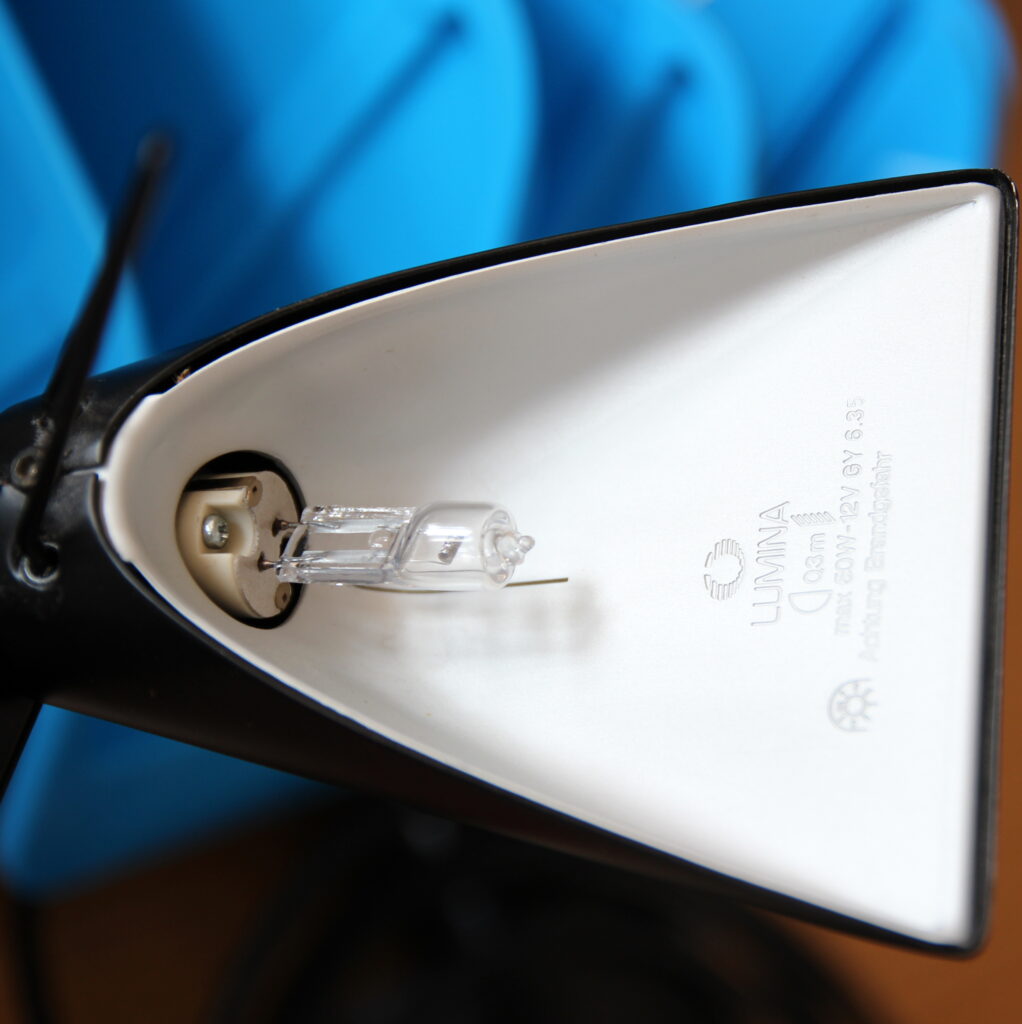 Das verwendete Leuchtmittel ist eine klassische 12 V Halogenlampe mit GY6,35 Sockel.