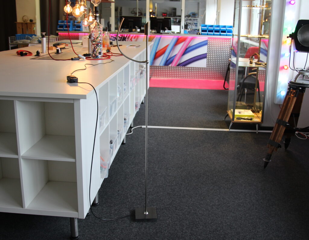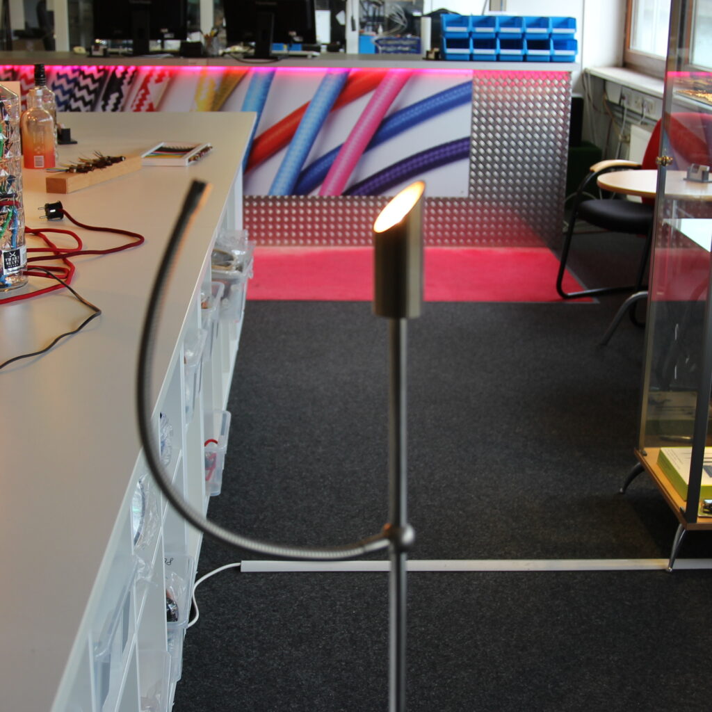 Die Stehlampe besitzt einen Schnurdimmer mit Touch-Funktion, der gleichzeitig als Transformator arbeitet.
