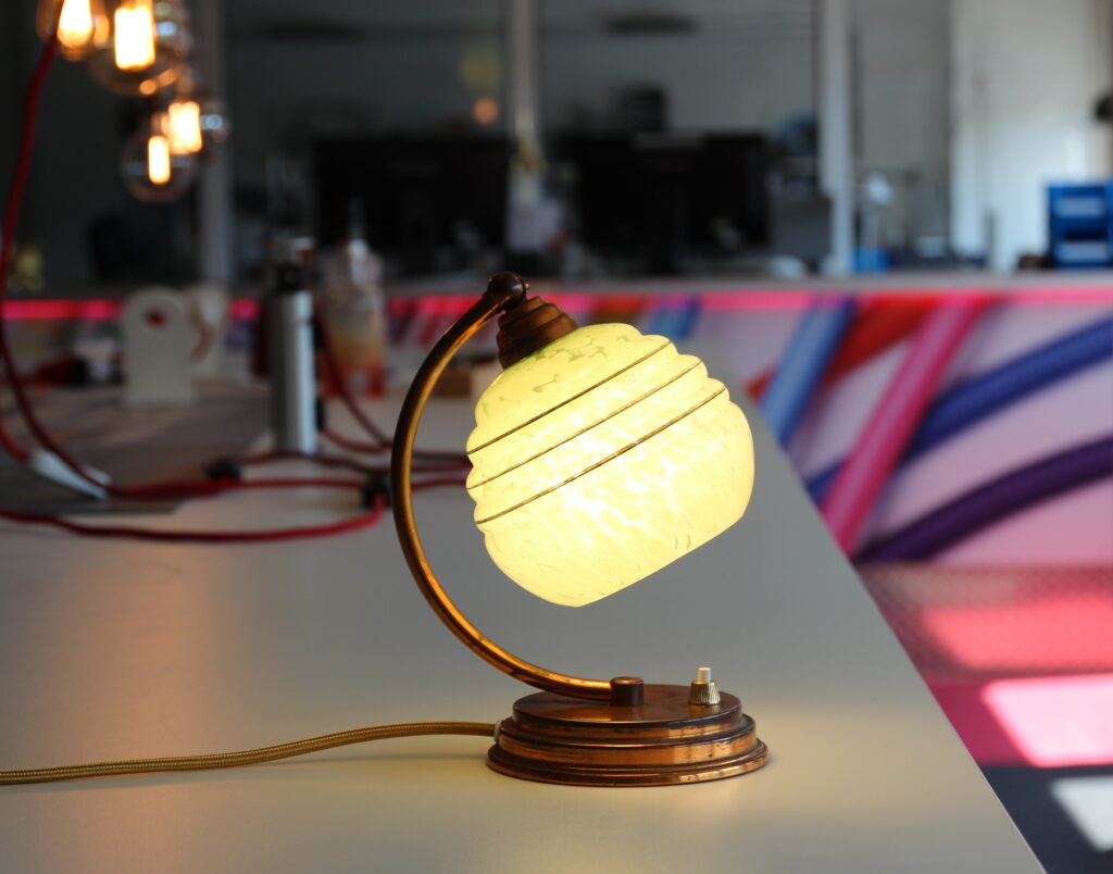 Unsere Kundin hatte diese dekorative Leuchte auf einem Flohmarkt erworben und uns zur Überprüfung der Elektrik übergeben. Ziel war es, die Lampe technisch auf den neuesten Stand zu bringen und gleichzeitig ihren originalen Charakter zu erhalten.