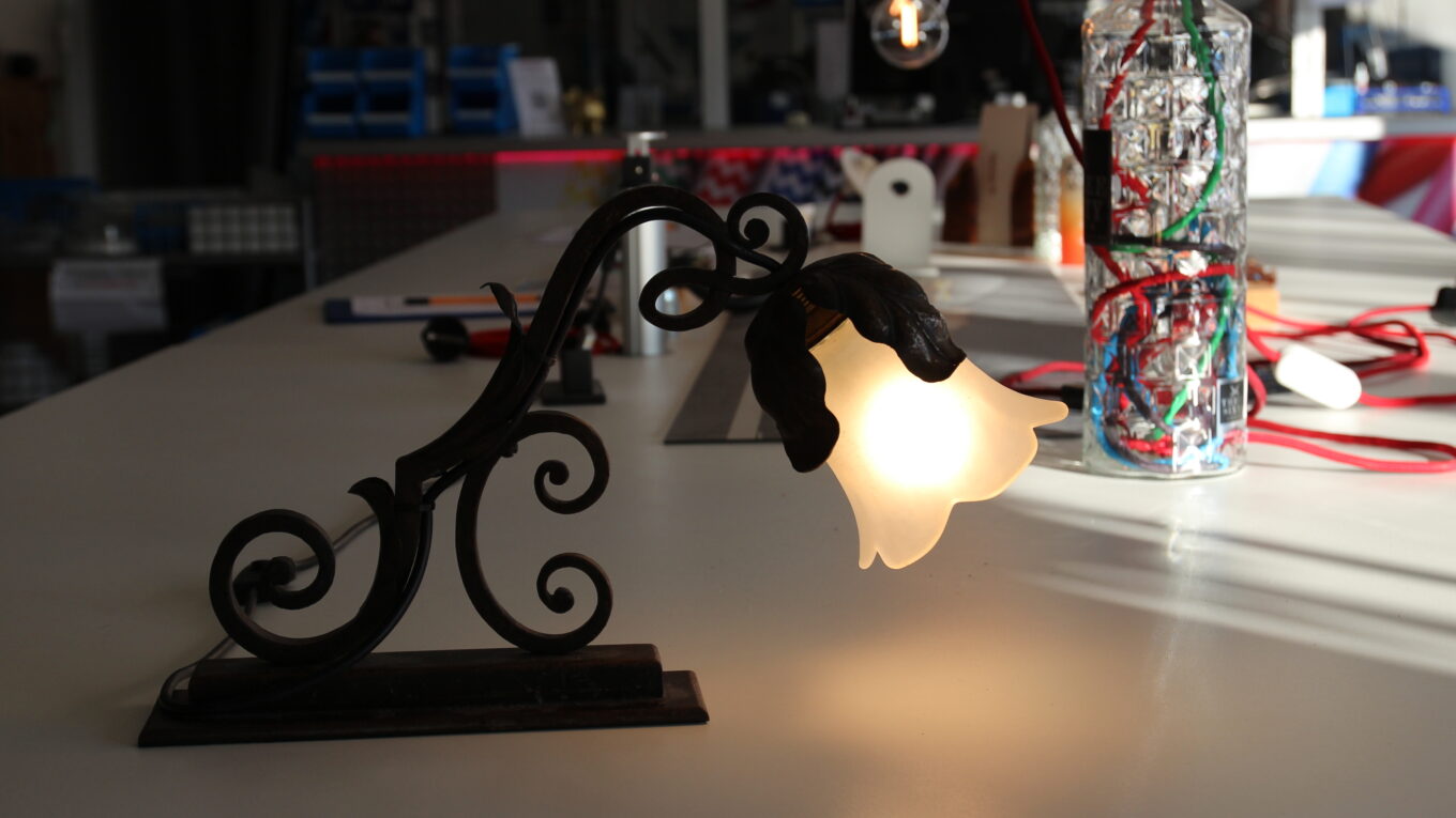 Unsere Kundin brachte uns einen handgefertigten schmiedeeisernen Tischlampensockel, der ursprünglich keine elektrische Ausstattung hatte. Die Aufgabe bestand darin, den Lampenfuß fachgerecht zu elektrifizieren und einen passenden Glasschirm zu montieren.